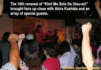 Ten times since 2000, Akira "Qu-cy" Kushida has served up the ultimate in service: the "Kimi Mo Solo De Utau-zo!" event, where fans can gather to enjoy Qu-cy's songs and stories, and get a taste of what it's like on the other side of the mike, singing their favorites onstage for Qu-cy and the crowd. Once an annual event, "Utao-zo!" has expanded to three weekends a year--and the second of 2005, held August 6-7, was its gala 10th renewal. The site was cozy live house Nishi Shinjuku Hideaway, with reservations for the 3000 yen-a-day event taken in advance on Qu-cy's official site.