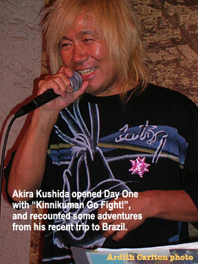 He shared some of his Brazil adventures with us, and coupled one tale with a Jiraiya trifecta of me singing opening theme "Jiraiya," Rei-san singing ending theme "Shi-No-Bi '88" and Mukou-san singing "Jiraiya Sanjou!": When Qu-cy arrived in Brazil, an airport Customs official who was examining his passport recognized his name from the Jiraiya TV credits. The official called his buddies over, and other airport staff and curious public came flocking too--"Akira Kushida! Ninja Jiraiya!" The disturbance drew the attention of airport security, and as Kushida watched worriedly, a gorilla of a guard came over, eyeballed the scene...and then muttered into a walkie-talkie, "It's, uh, Ninja Jiraiya." We were hooting!