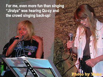 After that, we all joined in on "Fuji Safari Park" (this has been one of the most famous commercial songs in Japan for years, and finally got a CD release in 2005!). Qu-cy brought the evening to a close with "Uchuu Keiji Gavan," sharing the mike for each of us to sing a different line, and then saw us off with thanks. I was able to get the next-to-last train back up to Gunma...and then turned around a few hours later to come back for Day Two. (Next time, have gotta remember to make a hotel reservation in time...)