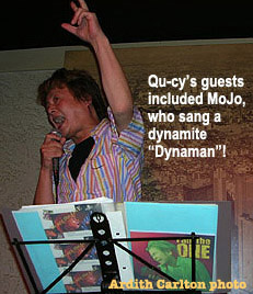 The song started, and the crowd seemed surprised and glad to hear it again (it's a fun song, with parts for the audience to sing too). I'd requested a key two below the original--but guess what? The UGA karaoke system I'd based that on is wrong. It was a key too low...so I was an inch tall and trying to hit notes just beneath reach. Right before the chorus, though, someone at the controls bumped the key blessedly upward--and with the crowd going full-out, and Qu-cy singing back-up on the chorus, I went from an inch tall to sky-high and sang the song!
