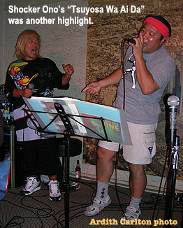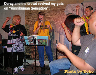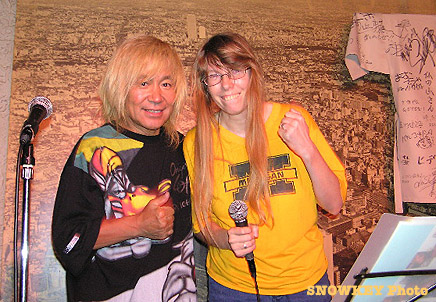 One youngster likely sharp enough to get it was the day's youngest attendee, Ta-kun. An "Utao-zo!" veteran who looks to be about 8 and attends with his mother, Ta-kun sang "Ginga No Tarzan" this time. (The first line of "Ginga No Tarzan" is "Chichi o shiranai, haha o shiranai"--"I don't know my father, I don't know my mother"--"You don't know your mother?" Qu-cy jibed him afterwards. "There she is!") Mother Hi-san sang too, performing "Ai No Tsubasa."