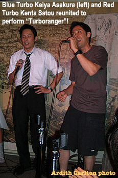The evening's special guests trooped in soon after: MoJo, Ryousuke Sakamoto (Red One of Bioman), Kenta Satou and Shocker OH!NO!. Keiya Asakura, Turboranger's Blue Turbo to Kenta Satou's Red Turbo, arrived a little later in salaryman suit. MoJo sang "Sega Sataanshiro" and "Kagaku Sentai Dynaman," and then the guests kicked back with beers and took seats along the rear of the stage for the last few attendee performances. C-bouzu-san sang "Wakasa Wa Plasma," and when he mentioned at song's end how fast his heart was beating, he was swamped by the guests all trying to feel his chest!