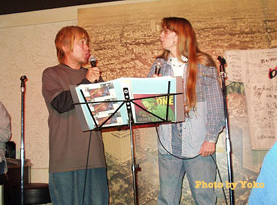 Had entered for the Saturday-night session, and was among the last of some 25 or so people to arrive at the Hideaway, a dark, comfy place like an extra-large living room outfitted impressively with a bar, stage and sound system. You're required to buy a drink when you get there, and then my 1300-yen Bloody Mary and I were directed over to a seat between a photographer gal and a boisterous clump of guys. Sat pretty nervously for a while, but the photographer, Yo-san, thankfully had more guts than me, and soon we were chatting.