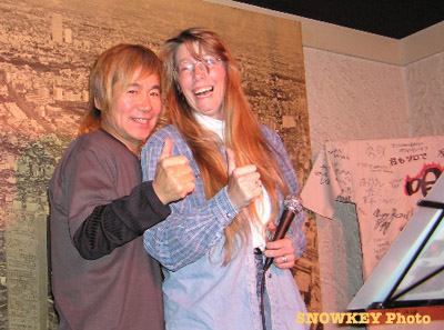The show was emceed by a fellow known as Notchi, and Qu-cy sang a new song called "Dragonman To Issho Ni." Then they drew gashapon balls, each labelled with a show title, from a bag to determine the order entrants would sing. The entrant would be called up to the stage, and Qu-cy would speak with them as Notchi leafed to the page of that song's lyrics in a songbook on a music stand onstage (no TV-screen karaoke system, and no furigana; you read the lyrics right off the page). Then the song would start, with the entrant singing and the crowd singing along, and Qu-cy sitting onstage listening; in the break between the first and second verse Qu-cy would jump up next to the entrant and a staffer would snap a photo, and then the entrant continued with the rest of the song. After that, Qu-cy would speak with them a little more, most often asking, "How did it feel?" The beaming entrant would grin, "It felt great!", and we'd all roar!